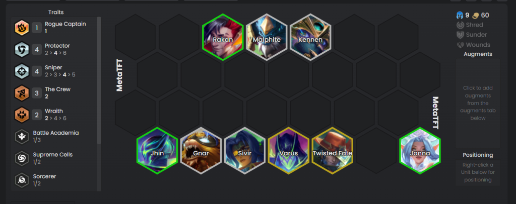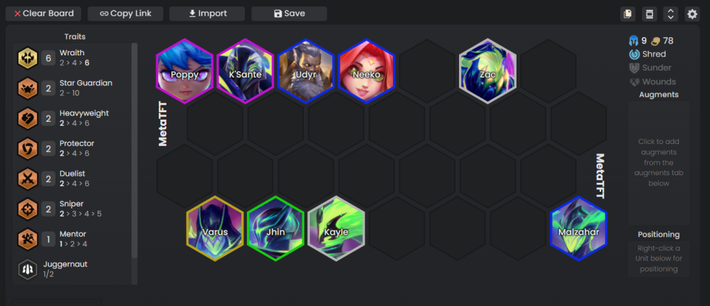 Comp terbaik untuk dimainkan saat menggunakan Pantheon sebagai Guide adalah comp Wraith dengan fokus reroll untuk mendapatkan 3-star Kayle dan Zac. Comp ini memiliki jumlah frontline dan backline yang seimbang serta mengaktifkan trait Protector, membuat unit semakin kuat saat mendapat shield dari skill Pantheon sebagai guide. Setelah mendapat 3-star Kayle dan Zac, kalian bisa berfokus pada levelling untuk melengkapi board serta meng-upgrade Kayle yang semakin kuat saat pemain naik level.