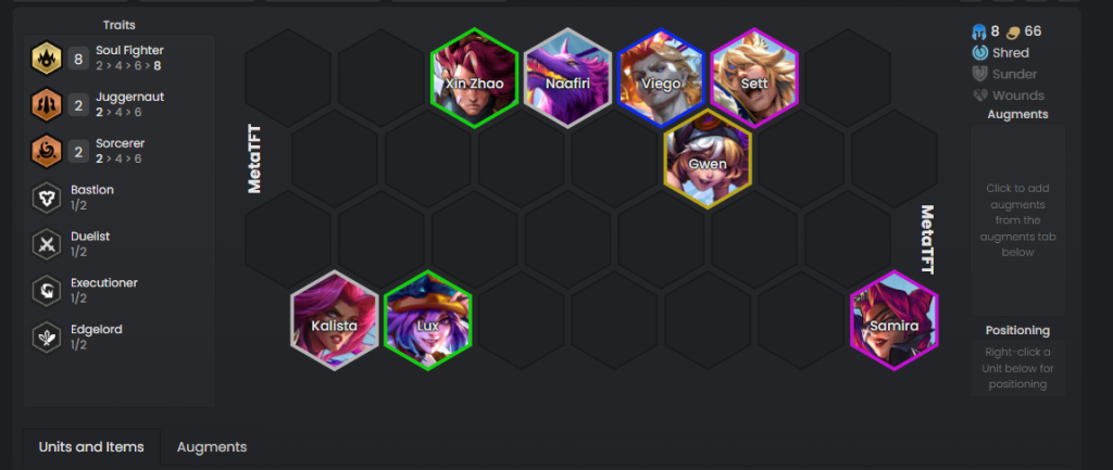 Soraka adalah Guide yang bisa dibilang sangat fleksibel untuk dimainkan di berbagai jenis comp berkat Guardian yang ditaruh di board sebagai unit tambahan yang bisa digunakan sebagai tank. Varian Dawnbringer juga memberi augment Dual Purpose, menjadikan aksi levelling dan reroll menjadi satu, sangat cocok saat dimainkan dengan comp Soul Fighter.