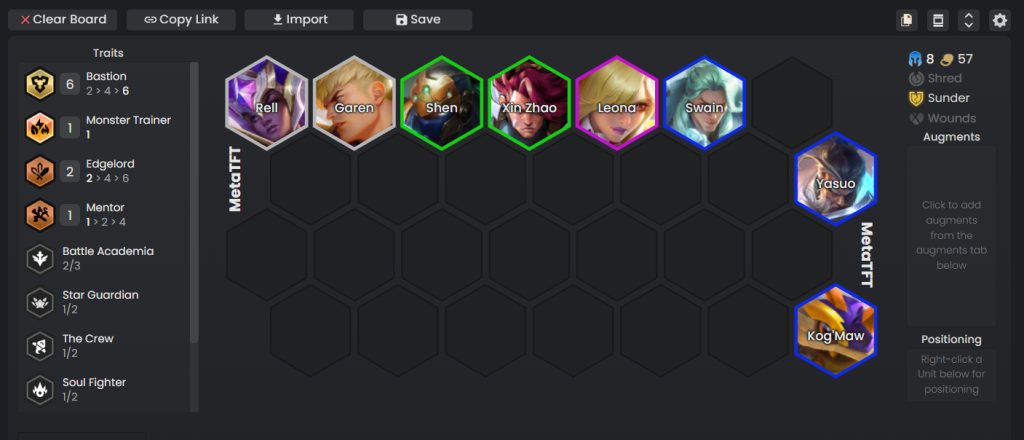 Comp ini mengaktifkan trait 6 Bastion, di mana unit frontline mendominasi susunan board, menjadikan Kog’Maw sebagai satu-satunya unit di backline. Idealnya, kalian memiliki 3-star Swain dan Kog’Maw serta Artifact best in slot Kog’Maw seperti Dawncore, Lich Bane, dan Wit’s End.