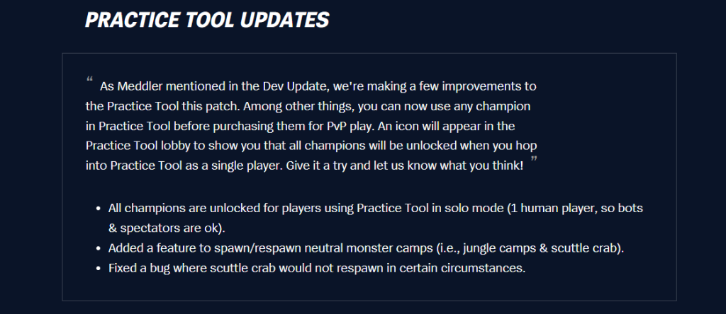 Ada beberapa hal yang perlu dicatat terkait update ini, salah satunya adalah kemampuan untuk mencoba semua champion di Practice Tools ini hanya terbatas untuk satu pemain saja, tetapi pemain tetap bisa menambahkan bot atau mengundang spectator.