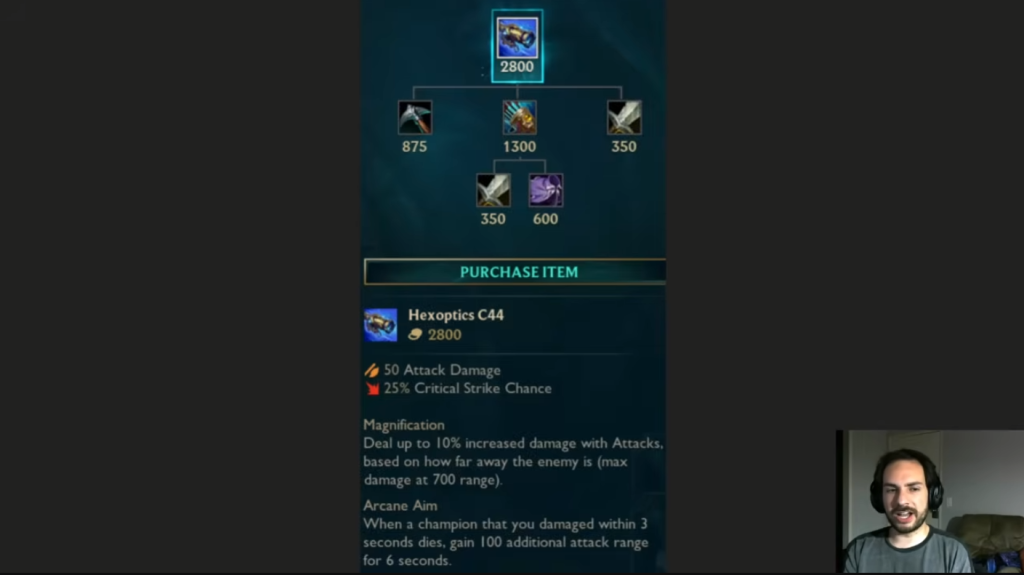Hexoptics C44 adalah nama dari item yang sempat diberi kode “long range ADC” dalam bocoran yang muncul beberapa hari lalu, di mana item ini akan memberi damage tambahan berdasarkan jarak musuh dari pengguna Hexoptics C44, item yang sangat cocok digunakan oleh Caitlyn, tetapi juga Kog’Maw dan Twitch jika keduanya ingin mem-build item critical.