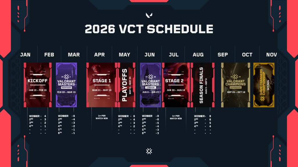 Satu bulan menuju tahun 2026 dan sekarang ini Riot sudah mulai sibuk menata jadwal dan membuat kalender untuk esports game mereka. Setelah menutup musim pada bulan Oktober kemarin, ada waktu dua bulan bagi Riot untuk membuat kalender tahun 2026. Sekarang, Riot sudah berhasil membuat kalendernya, dan tahun 2026 dari esports VALORANT akan dimulai di pertengahan bulan Januari.