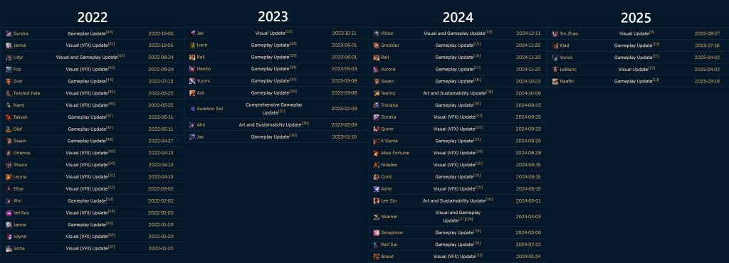 Sekarang, jikalau dibandingkan dengan tahun 2025 Riot hanya merilis champion update kepada Xin Zhao dan LeBlanc saja. Sedangkan dari gameplay rework hanya ada tiga yang mendapatkannya, mereka adalah Kled, Yorick dan Naafiri. Kualitas visual update dari para champion juga tidak sebagus Skarner di tahun kemarin. Teori ini semakin kuat lagi ketika membandingkan hasil tahun 2022 ke 2023 yang kurang lebih sama.