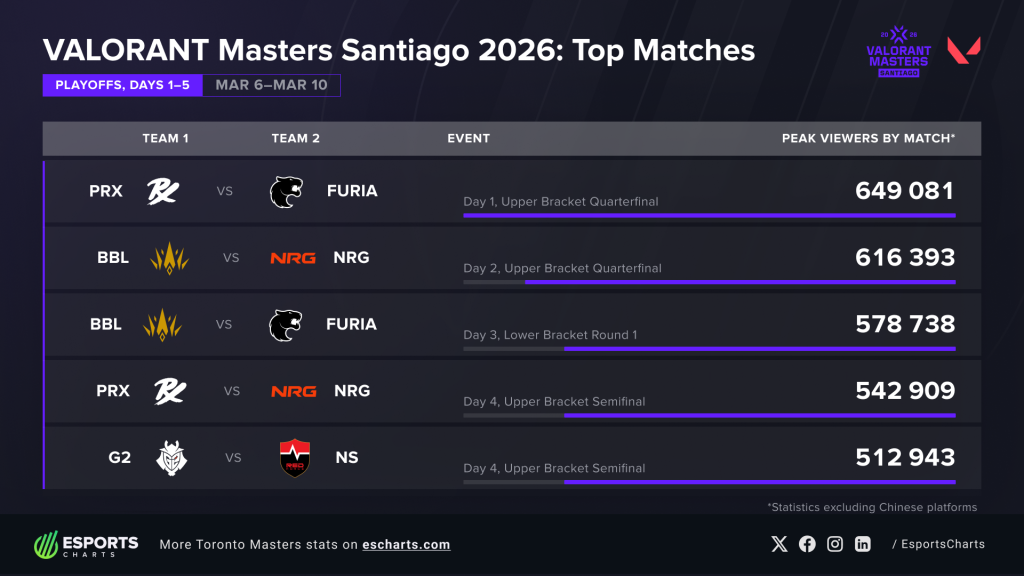 Selain pertarungan PRX vs FURIA, persaingan sengit antara NRG Esports dan BBL Esports juga mencatatkan angka yang impresif dengan lebih dari 616.000 penonton serentak.