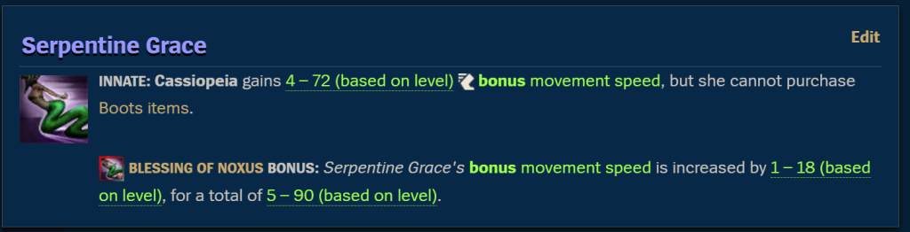 Ya, pasif baru ini tidak jauh berbeda dari Serpentine Grace versi live server, tetapi perlu dicatat bahwa kini tidak ada tulisan yang mengatakan bahwa ia tidak membeli boots. Ini berarti, Cassiopeia bisa membeli boots layaknya champion biasa.