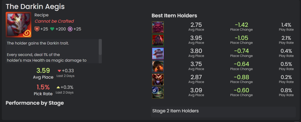 The Darkin Aegis adalah item yang ditujukan untuk unit Tank, terutama yang mampu mengumpulkan HP sebanyak mungkin karena efeknya adalah memberi damage ke musuh di sekitar berdasarkan HP maksimal penggunanya. Maka dari itu, unit pengguna The Darkin Aegis terbaik saat ini adalah Ornn, Sion, dan Braum.