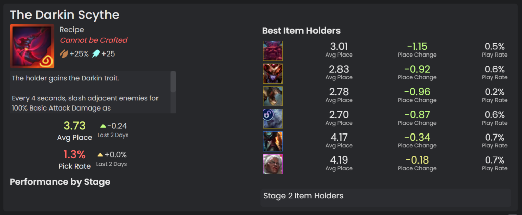Terakhir adalah The Darkin Sythe, item yang ditujukan untuk frontliner Fighter yang membutuhukan tambahan stat ofensif dan bertempur dalam waktu lama, memberi damage di sekitar penggunanya tiap beberapa detik. Uniknya, Ornn dan Fiddlesticks mengisi dua dari top 3 pengguna item ini.
